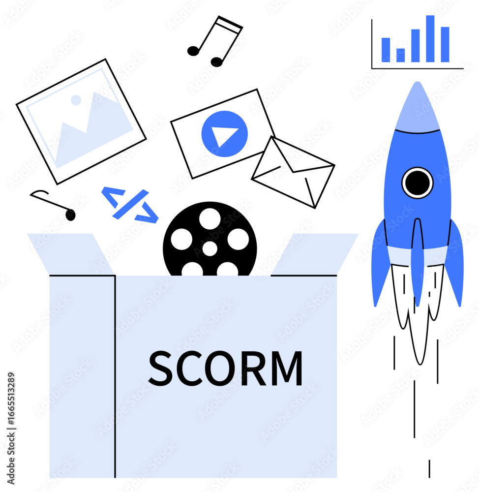 Obraz na płótnie Canvas - Box labeled SCORM releasing media files, music notes, code, email, chart, and rocket icon. Ideal for e-learning, development education technology multimedia progress innovation. Simple flat.