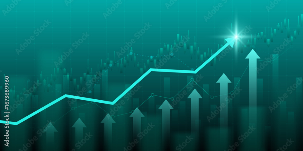 Obraz na płótnie Canvas - technology financial graph with uptrend line arrow and bar chart of stock market on blue color background.