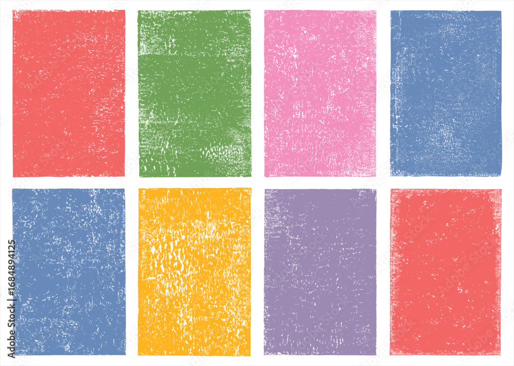 Obraz na płótnie Canvas - Grunge distressed rectangles 2:3 set. Linocut, relief printing textured shapes rough textures. Retro vintage backgrounds collection, text frames. Paint roller aged stains, lino ink grungy remains.