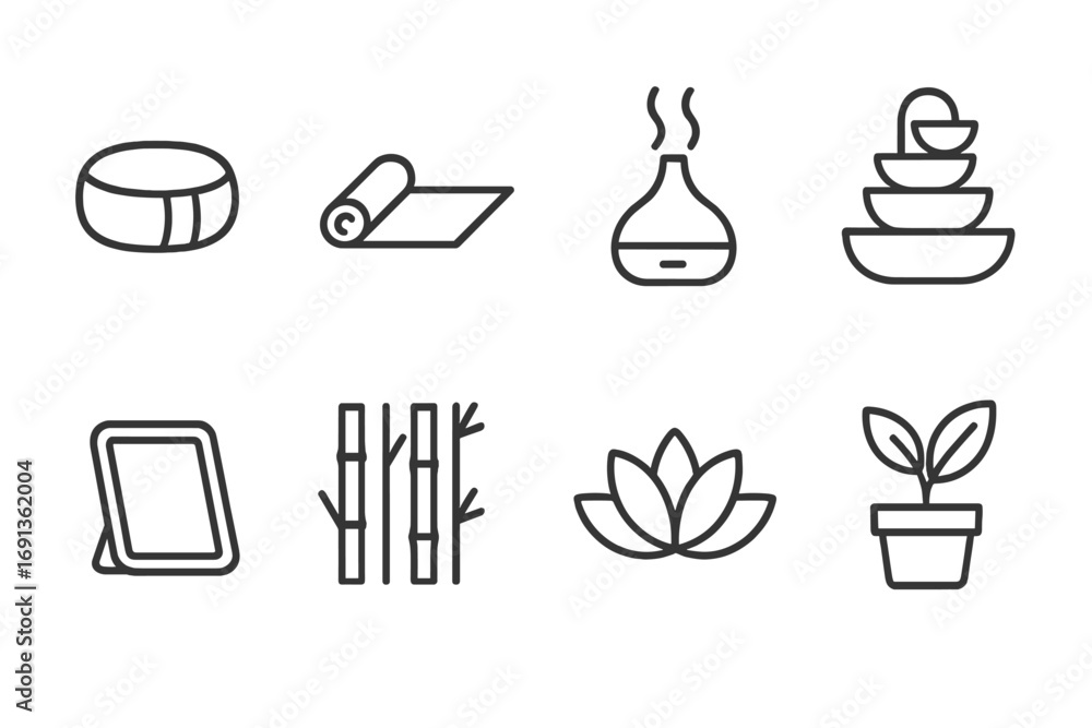 Obraz na płótnie Canvas - Wellness Icons Grid. Outline icon set of wellness spaces: meditation cushion, yoga mat, aromatherapy diffuser,.