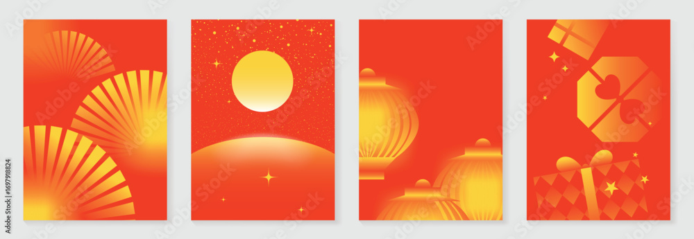 Obraz na płótnie Canvas - Chinese New year poster design vector set. Modern new year red and gold card with lantern, fan, moon, gift in geometric shape. Illustration for flyer, brochure, social media, banner, ads..