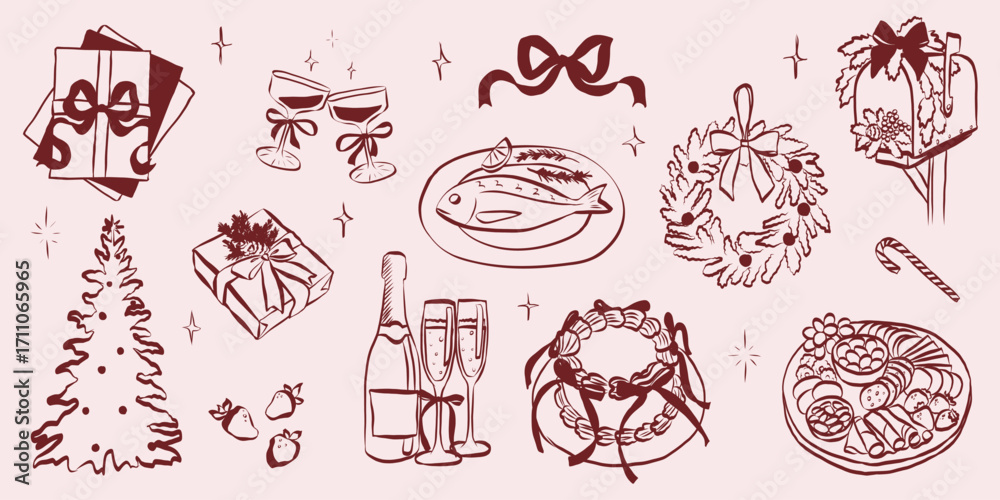 Obraz na płótnie Canvas - Whimsical chalk doodles of Christmas party. Quirky icons of breakfast and dinner meals in crayon style. Crayon drawing for menus and invitations. Handwriting quirky vector illustration.