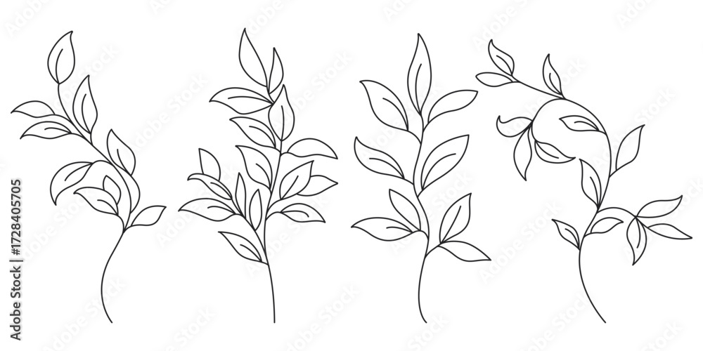 Obraz na płótnie Canvas - Leaves Branch Set Trendy Line Art Style. Floral Line Art Drawing Collection for Poster, Print, Social Media, Wallpaper, Greeting Card. Leaves Minimalist Illustration Set Hand Drawn Vector Illustration.