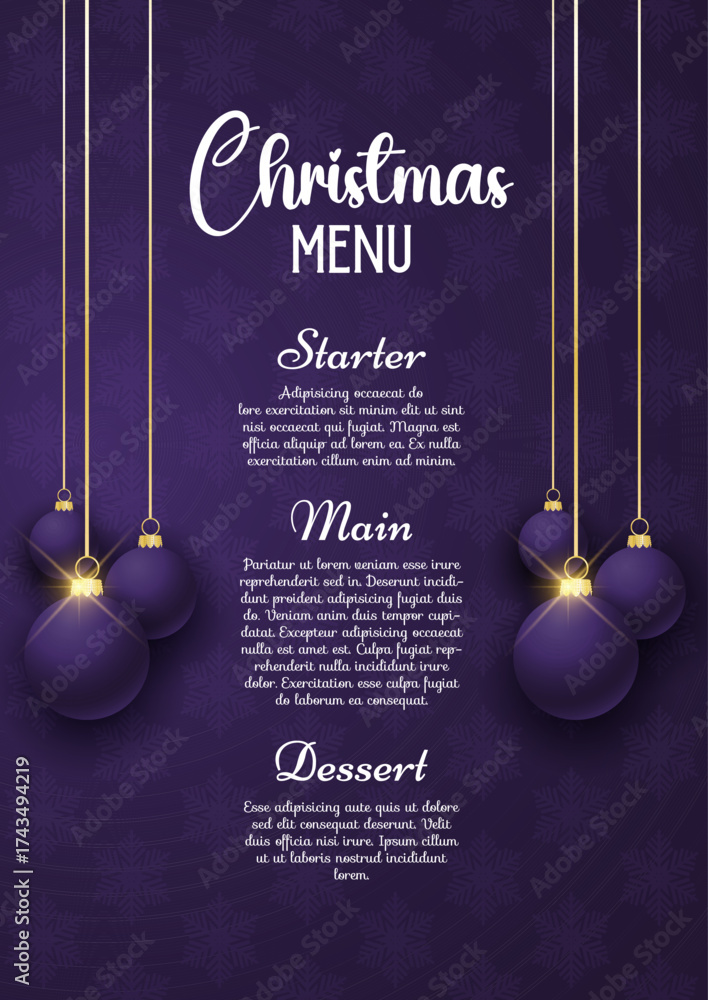 Obraz na płótnie Canvas - Elegant Christmas menu background with hanging purple baubles .