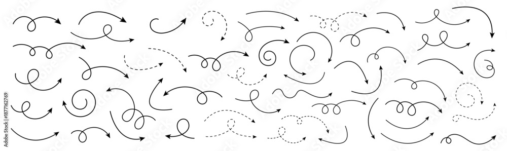Obraz na płótnie Canvas - Curved Arrows Set, Smooth and Dashed Line Arrows for Direction, Emphasis, and Highlighting.