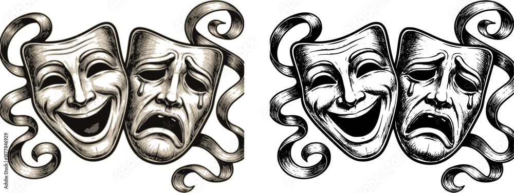 Obraz na płótnie Canvas - Theater or theatre drama comedy and tragedy masks in a vintage woodcut etching style.