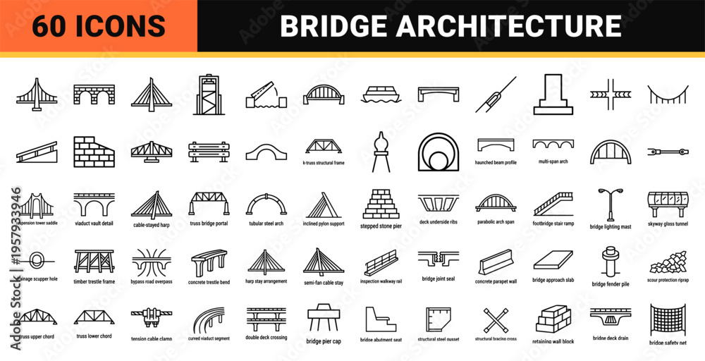 Obraz na płótnie Canvas - Civil Engineering Infrastructure and Bridge Architecture Minimalist Geometric Outline Icon Set for Urban Planning and Structural Design..