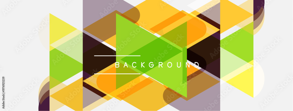 Obraz na płótnie Canvas - Abstract geometric shapes overlap. Colors include yellow, green, brown, purple. Design features lines, triangles, rectangles. Modern aesthetic..