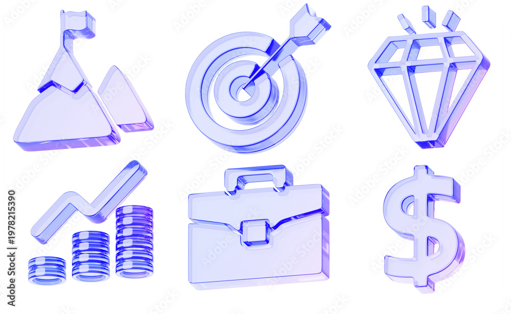 >Obrazy na płótnie Canvas>Wybrane motywy - zobacz więcej !>Zebra>3d glass holographic business icon set - briefcase, target, mountain peak with flag, diamond, money chart, dollar sign. Mission, vision, values, strategy and goal, financial success