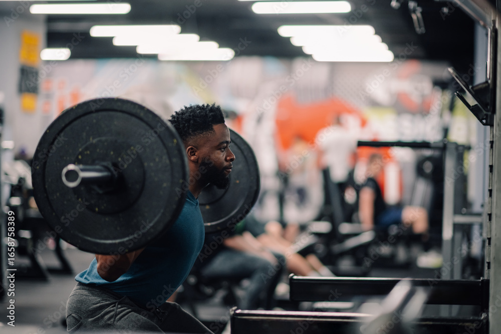 Obraz na płótnie Canvas - Determined bodybuilder lifting weights, performing squats in gym.