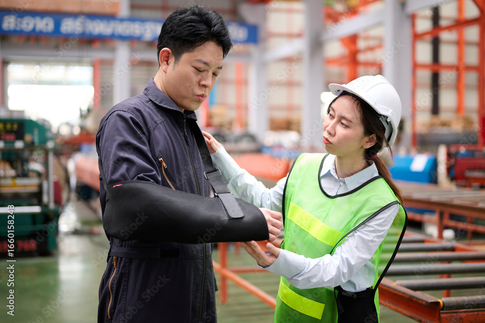 Obraz na płótnie Canvas - Engineer or technician wearing bandages splint, pain in elbow in arm and coworker encourage him in the factory.