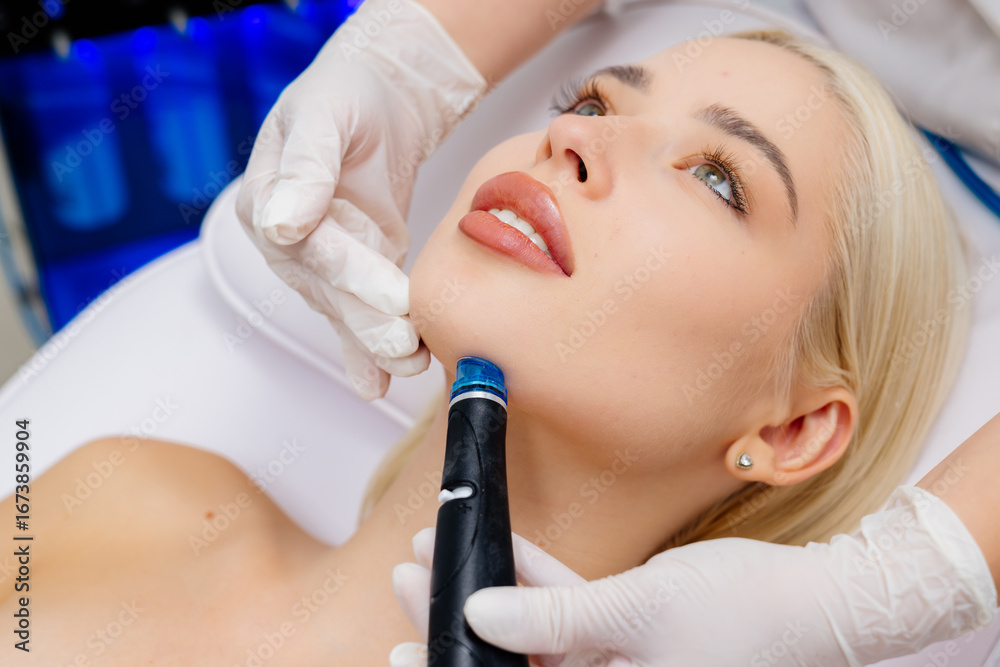 Obraz na płótnie Canvas - A young woman undergoing a hydra peeling procedure at a beauty salon. Concept skin care for achieving a healthy and glowing appearance..