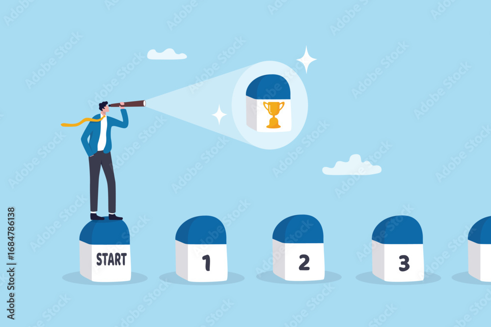 >Obrazy na płótnie Canvas>Wybrane motywy - zobacz więcej !>Zielony>Business milestones or achievement to reach goal or success, progress development, vision to see target destination, step to success, businessman look on telescope to see success trophy milestone.
