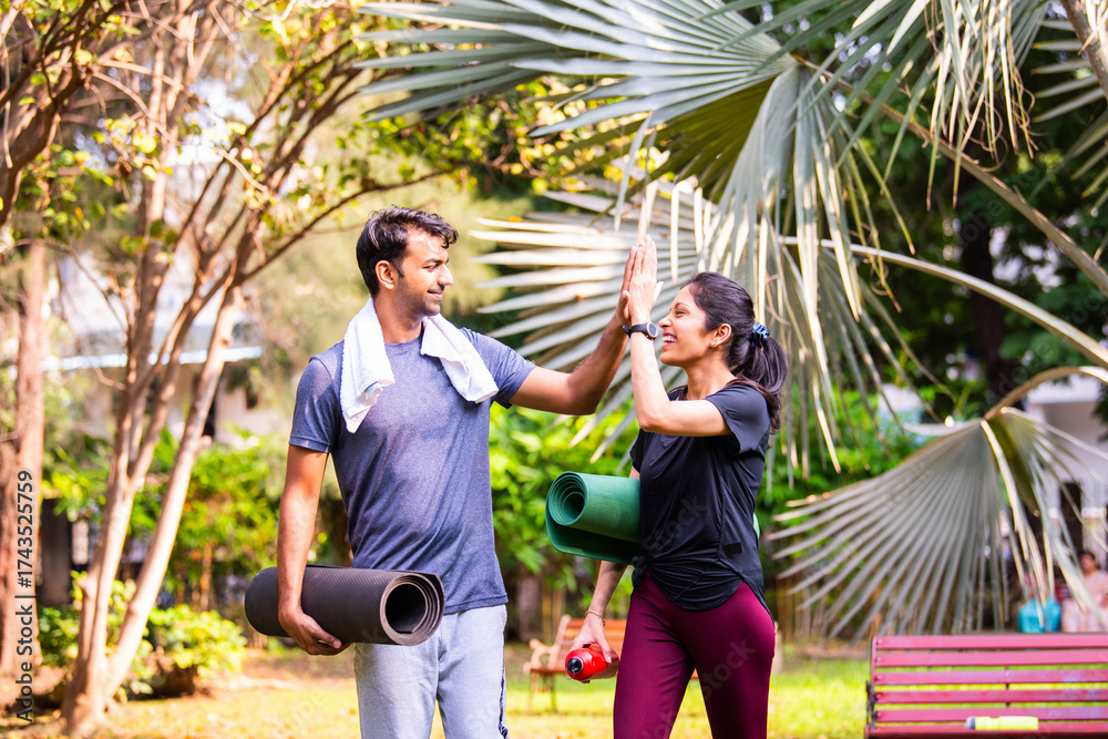 Obraz na płótnie Canvas - Indian beautiful young couple high five after yoga enjoying morning fitness outdoors.