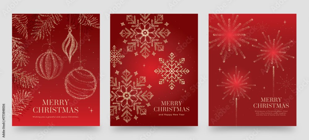 Obraz na płótnie Canvas - Luxury Red and Gold Christmas and New Year Flyer Poster with Glitter Snowflakes Ornaments and Fireworks.