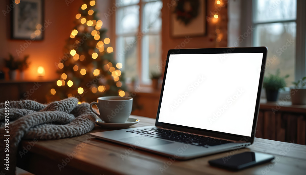 >Obrazy na płótnie Canvas>Wybrane motywy - zobacz więcej !>Zielony>Laptop with blank screen rests on wooden table beside hot beverage, cozy blanket. Decorated Christmas tree glows with warm lights in background, creating festive home office atmosphere. Festive scene