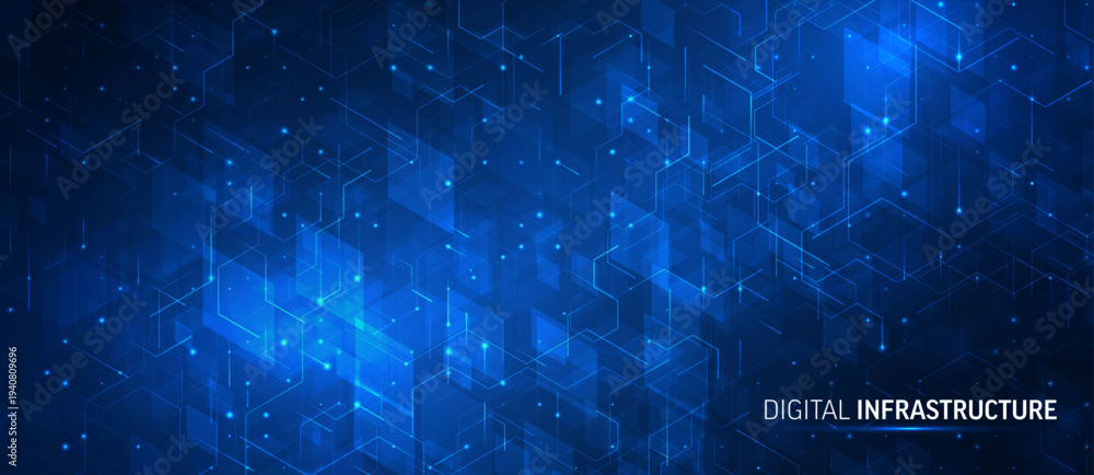 Obraz na płótnie Canvas - Digital infrastructure network. Isometric platform, cubes connected by lines. Abstract cloud, AI blockchain technology concept. Futuristic blue background. Big data server systems, business innovation.