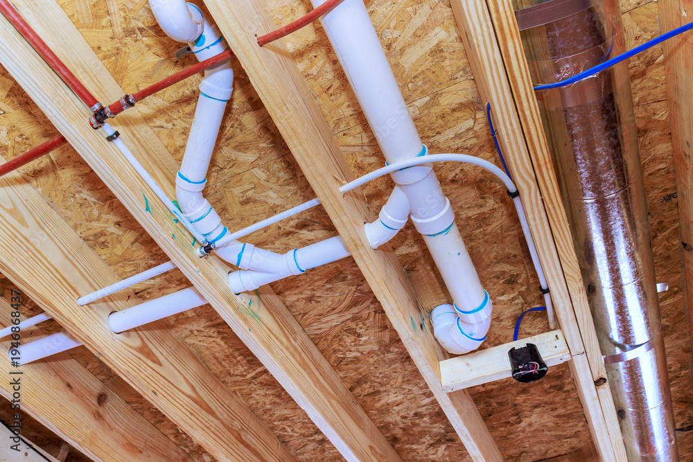 Obraz na płótnie Canvas - Pipes ducts installed under wooden ceiling in construction site for building project.
