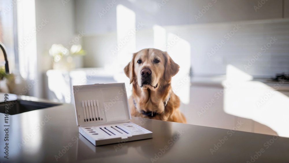 Obraz na płótnie Canvas - Golden Retriever and Canine DNA Test Kit on Kitchen Counter for Pet Ancestry Insights.