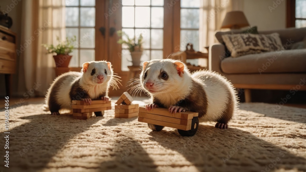 Obraz na płótnie Canvas - Two playful ferrets with wooden toys in a sunlit living room..