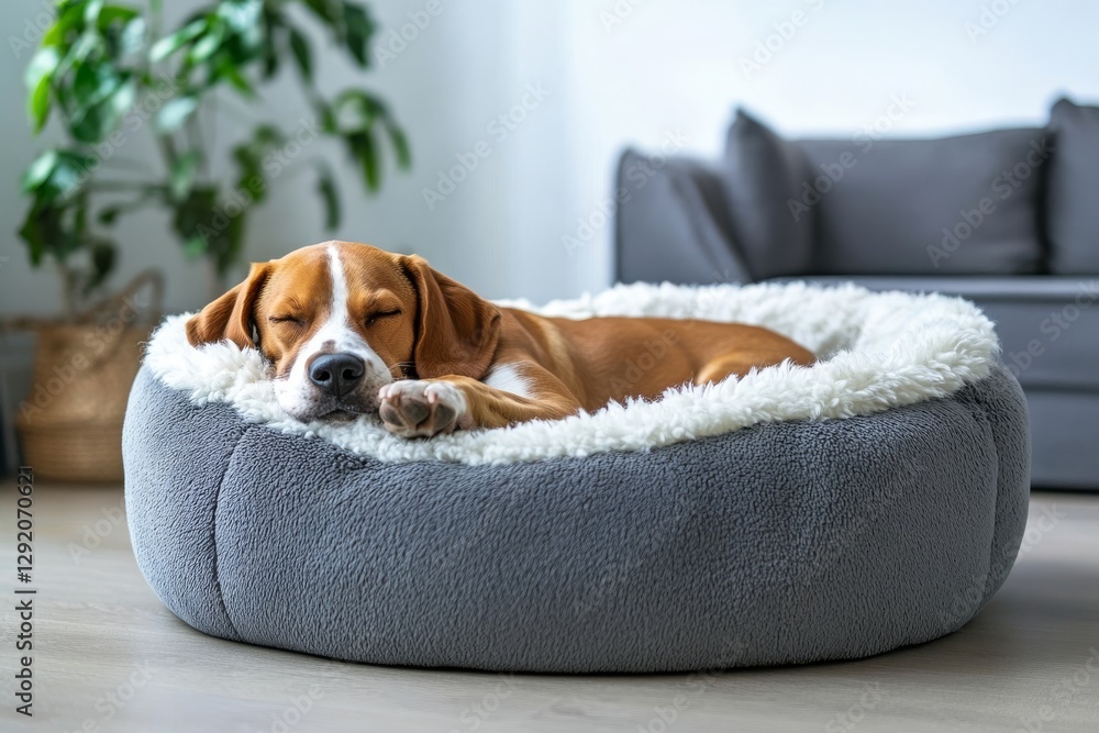 Obraz na płótnie Canvas - Beagle dog peacefully sleeping in soft fluffy bed at home.