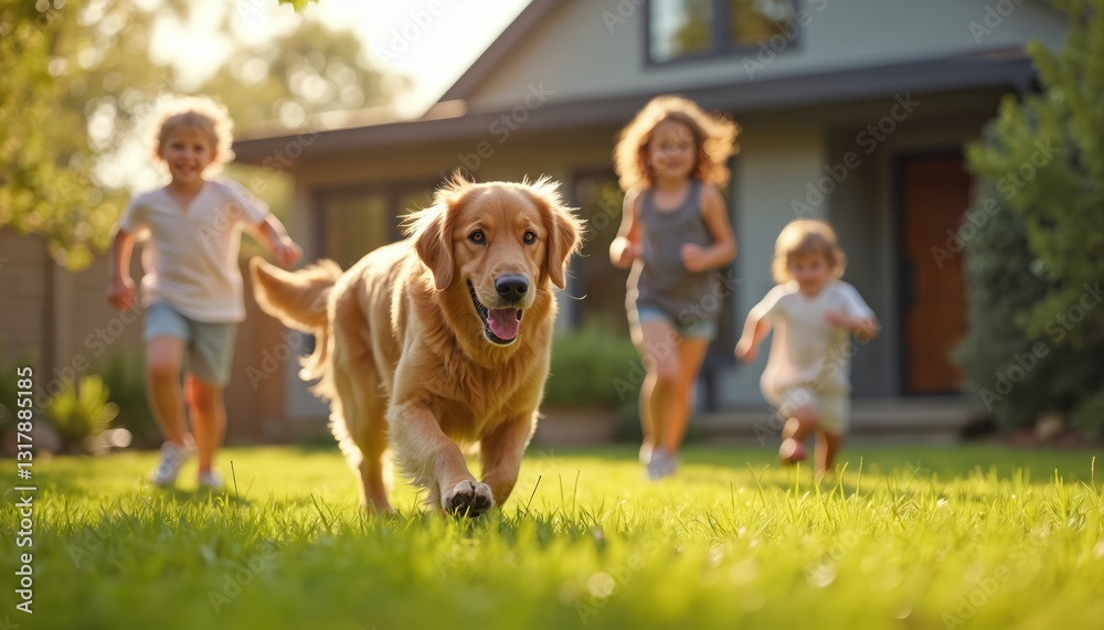Obraz na płótnie Canvas - Golden Retriever dog playing, running with kids on grass lawn in yard garden. Summer fun with family, pet outdoor. Happy doggy smile on bright sunny day near house..