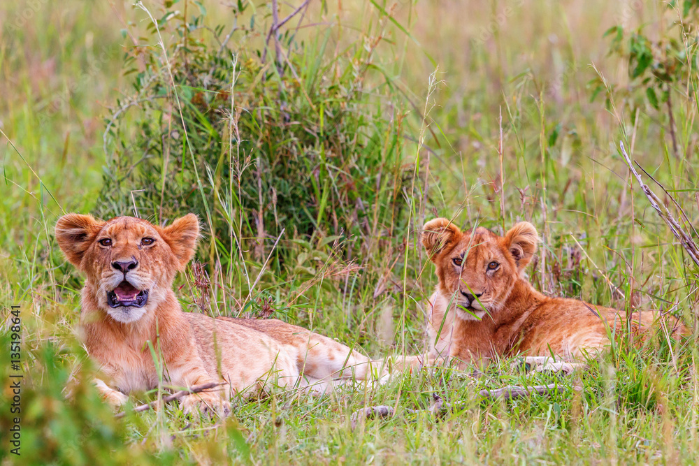 Obraz na płótnie Canvas - Two Lion Cubs lying in the grass in the savanna.