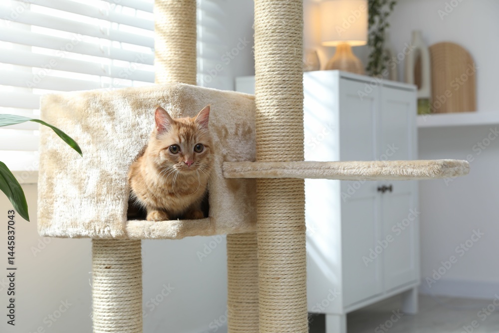 Obraz na płótnie Canvas - Cute cat hiding in house on pet tree at home.
