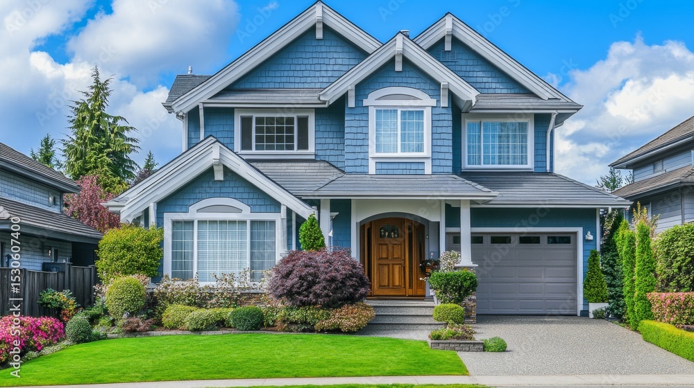 Obraz na płótnie Canvas - A charming light blue two-story home with steep roof, large windows, wooden door, manicured lawn, shrubs, and paved driveway under blue skies..