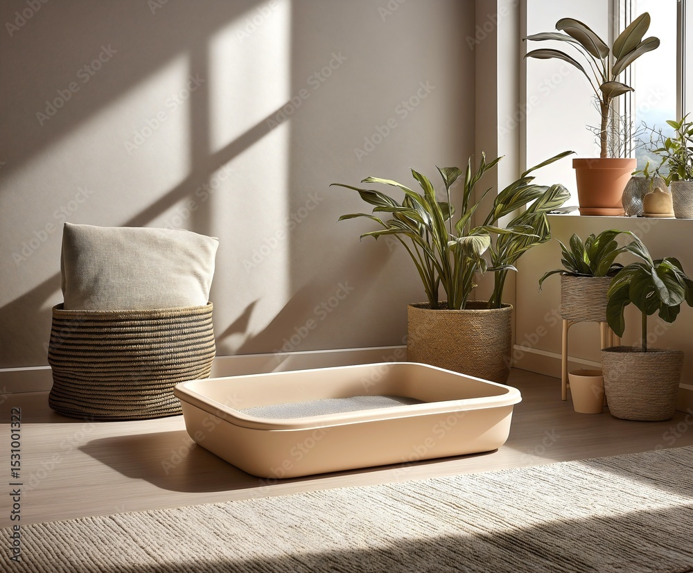 Obraz na płótnie Canvas - Cat litter tray in minimalist scandinavian interior with houseplants woven baskets and natural sunlight creating stylish pet friendly home design..