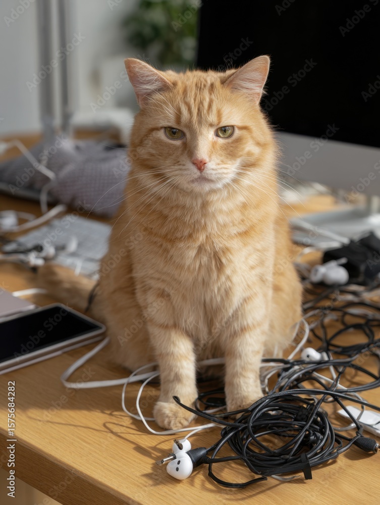 Obraz na płótnie Canvas - Curious cat playing with cables home office photography indoor eye-level whimsical scene.