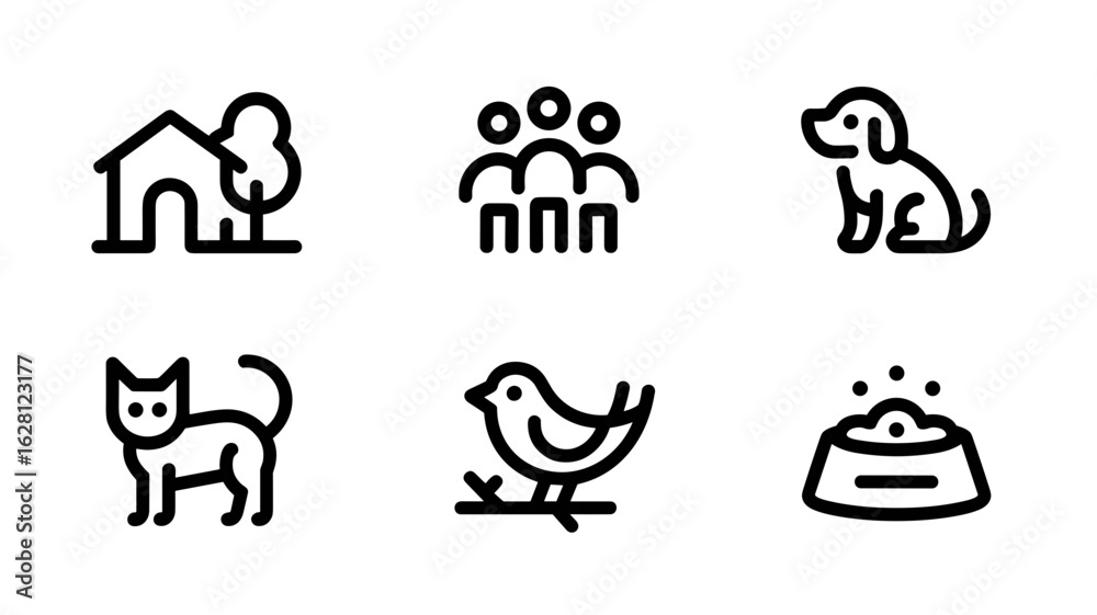 Obraz na płótnie Canvas - Doodle line art icons of house with tree, group of people, dog, cat, bird and pet food bowl .