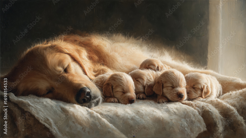 Obraz na płótnie Canvas - Golden retriever mother cuddling her playful puppies in a cozy home setting.
