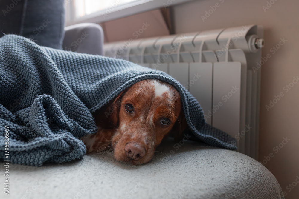 Obraz na płótnie Canvas - Brown and white dog partially covered by knitted gray blanket, resting on sofa close radiator, detail of cozy home interior showing warmth and comfort during winter..