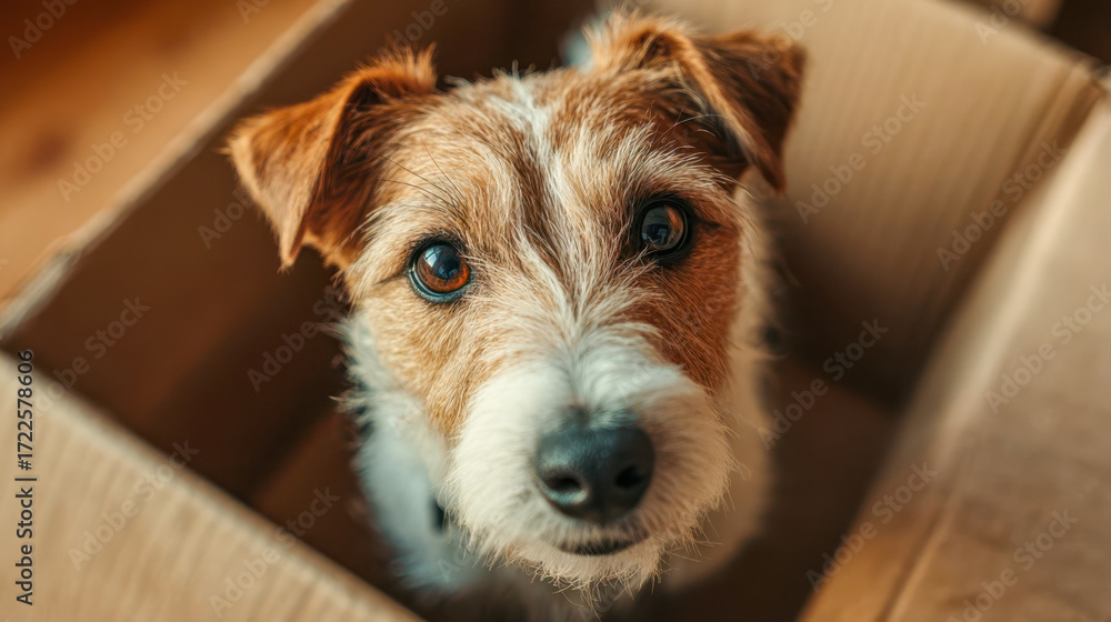 Obraz na płótnie Canvas - Cute jack russell terrier dog waiting in cardboard box.