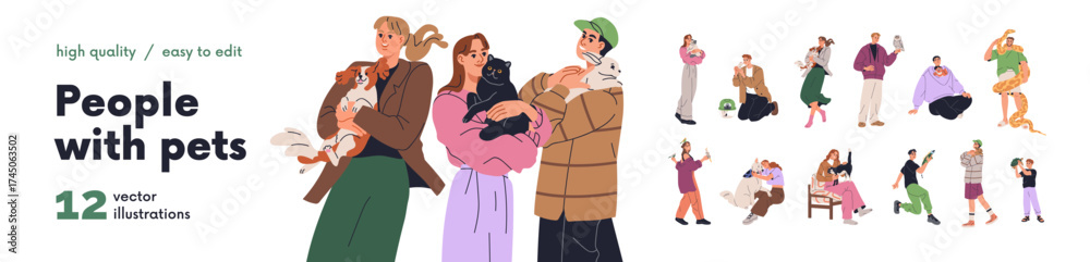 Obraz na płótnie Canvas - Happy people with different pets set. Home animal owners holding and caring for dog, cat, parrot, hamster, turtle, exotic iguana, boa snake, owl. Flat vector illustration isolated on white background.