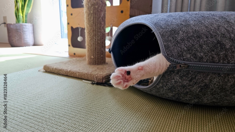 Obraz na płótnie Canvas - A cute white paw and pink toe beans stick out of a felt tunnel bed. This candid photo captures a humorous moment of a feline enjoying its cozy hideout and ultimate comfort on a tatami floor..