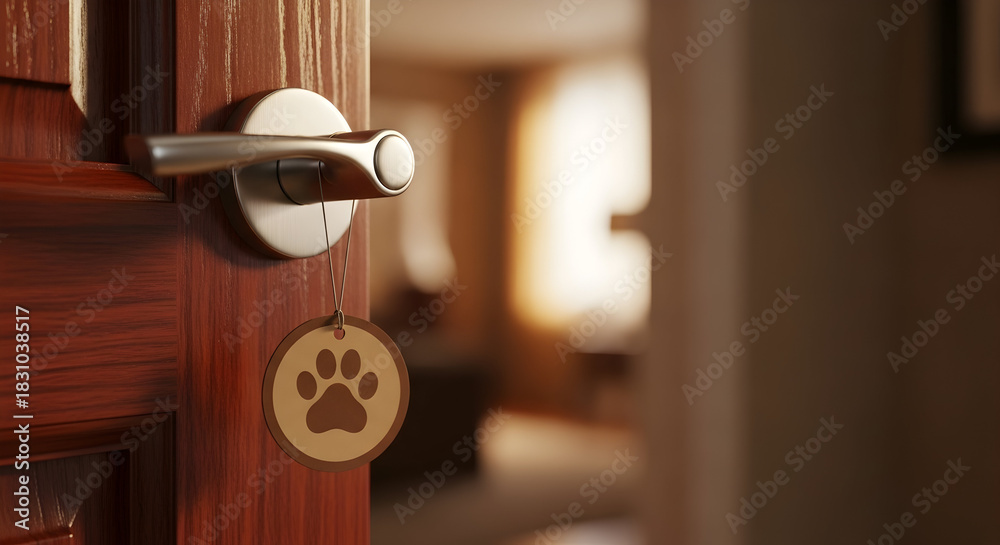 Obraz na płótnie Canvas - Door ajar revealing a cozy home with a dog paw shaped tag hanging on the handle Warm inviting atmosphere representing pets adoption safety security and welcome Home comfort.