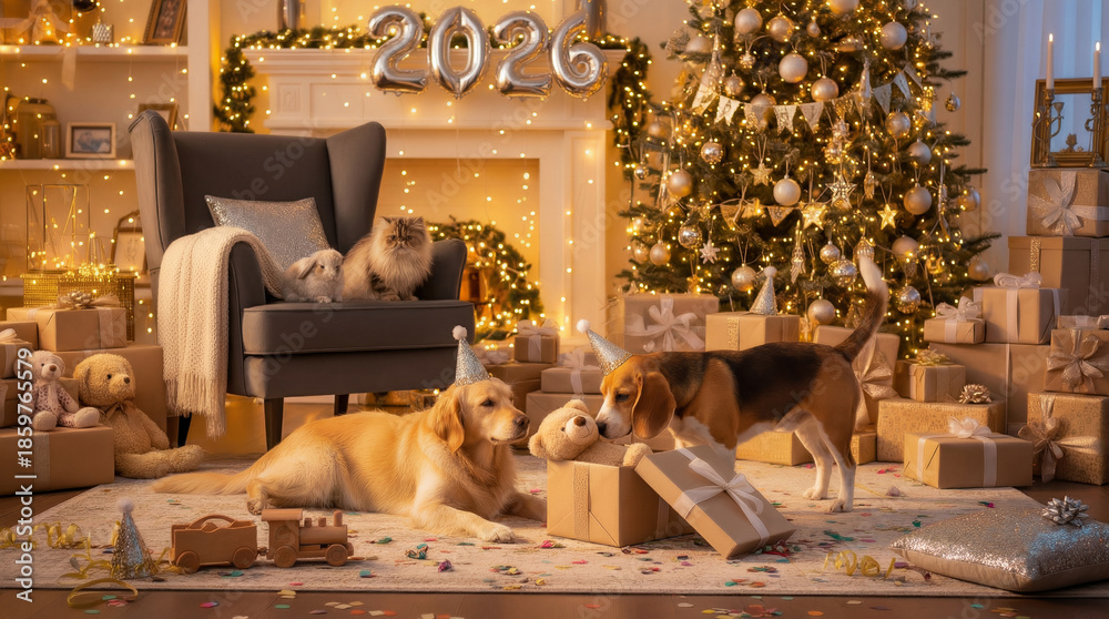 Obraz na płótnie Canvas - New Year celebration with pets and gifts.
