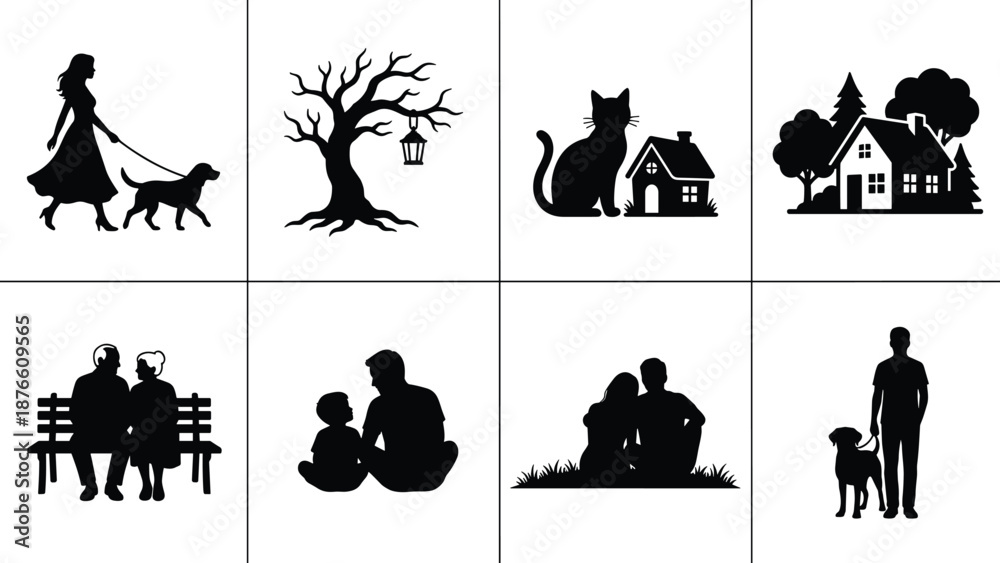 Obraz na płótnie Canvas - Lifestyle silhouette icons set showing people pets home nature scenes and family moments isolated black vector illustration.