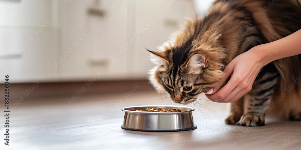 Obraz na płótnie Canvas - banner promoting caring for adopted cats, woman gently pets and feeds a Maine Coon cat in a kitchen at home.