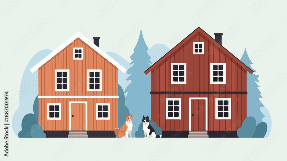 Obraz na płótnie Canvas - Two wooden houses with dogs and trees in a simple, flat illustration style.