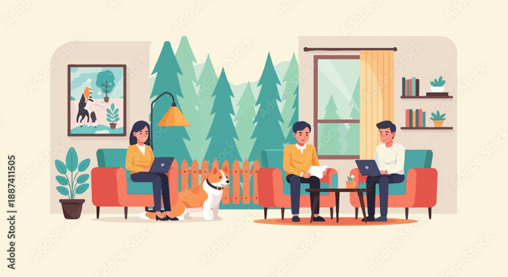 Obraz na płótnie Canvas - People working from home with dog, surrounded by plants and forest scenery.
