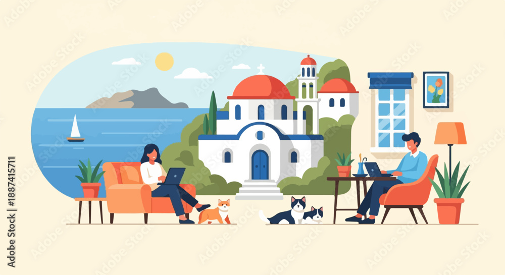Obraz na płótnie Canvas - People working remotely near Greek architecture by the sea with pets.