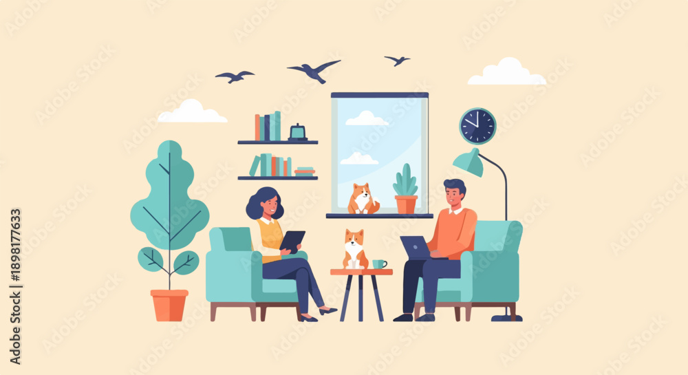 Obraz na płótnie Canvas - Two people and dogs relax at home with books, plants, and a window view.