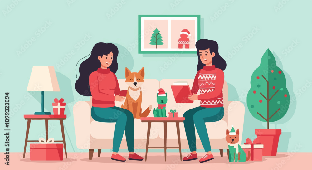 Obraz na płótnie Canvas - Two women and pets celebrating Christmas indoors with gifts and a tree.