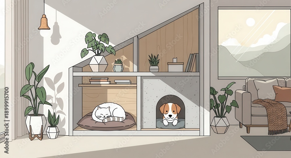 Obraz na płótnie Canvas - Cozy domestic scene features a custom built-in enclosure for pets and indoor greenery.
