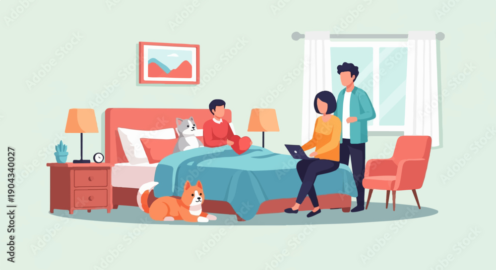 Obraz na płótnie Canvas - Couple and pets relax in bedroom with window and armchair.