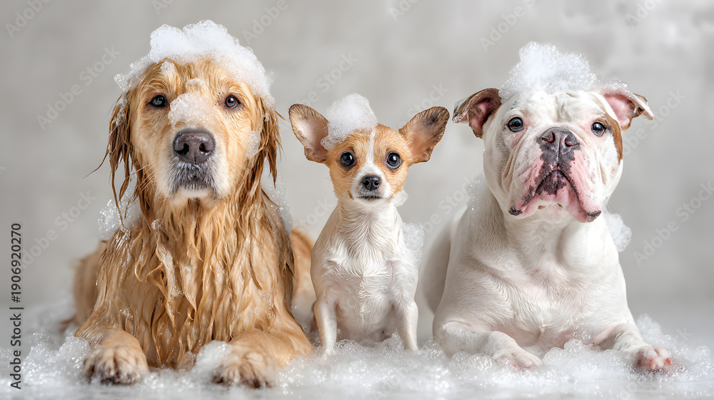 Obraz na płótnie Canvas - Three Dogs in Bath Foam, Grooming and Pet Hygiene Concept with Golden Retriever, Chihuahua and Bulldog.