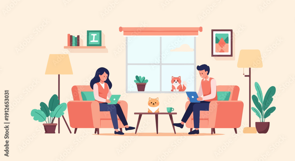 Obraz na płótnie Canvas - Two people relaxing in armchairs with laptops and pets nearby.